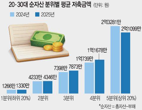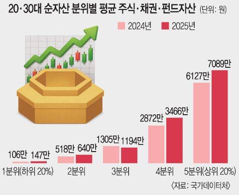 상위 20%는 금융투자를 할 경제적 여력이 크다. 지난해 순자산 5분위가 전체 금융자산 중 주식·채권·펀드에 투자한 비중은 33.6%로 1년 전보다 7.3% 포인트 늘었다. 반면 1분위에서는 주식·채권·펀드 자산 비중이 11%로 전년보다 2.6% 포인트 증가하는 데 그쳤다. 고소득 청년층일수록 충분한 자금을 바탕으로 공격적 투자를 했던 것으로 보인다.