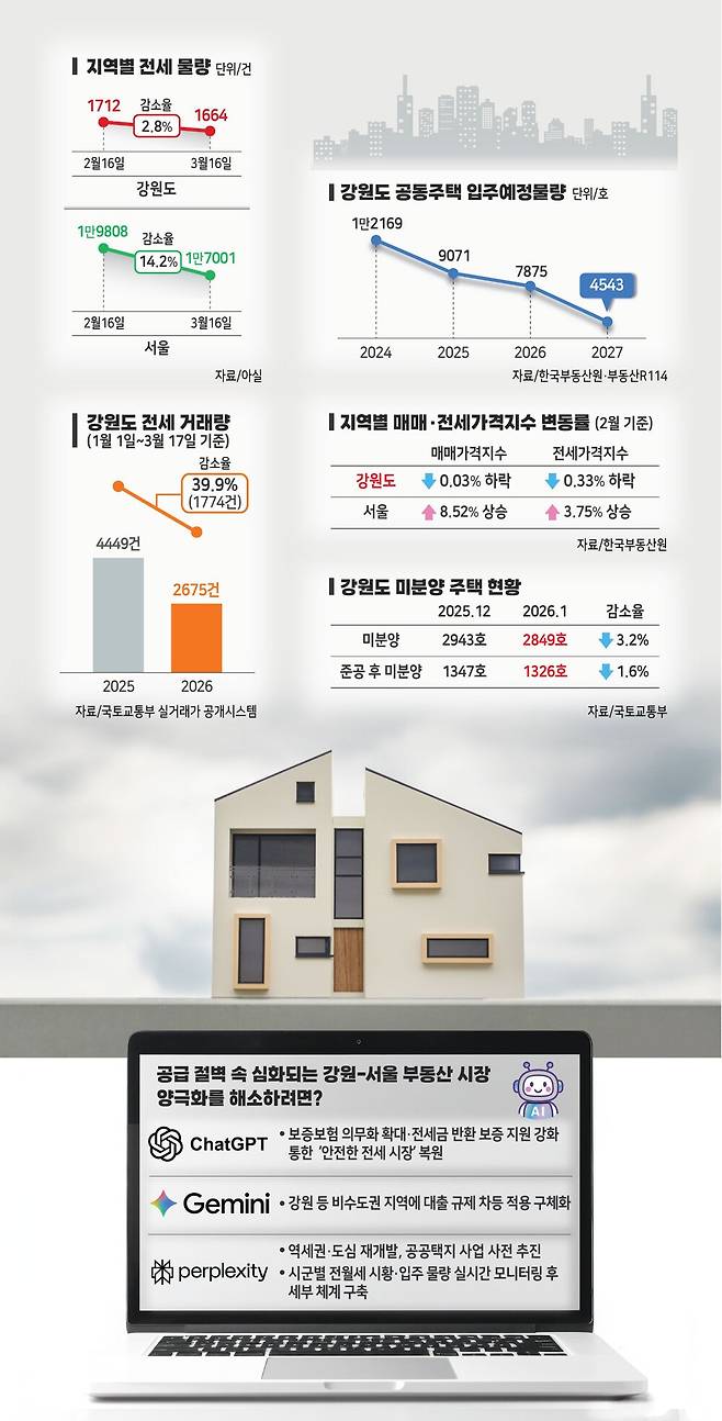 그야말로 ‘엎친 데 덮친 격’인 강원 부동산 시장에 해결책은 없을까. 챗GPT와 제미나이, 퍼플렉시티에 물어봤다. 챗GPT는 “줄어드는 공급에 가격이 오르지 않는 이유는 공급 감소보다 수요 감소 속도가 더욱 빠르기 때문”이라며 “보증보험 의무화를 확대하고 전세금 반환 보증 지원 강화를 통해 ‘안전한 전세 시장’을 복원해야 한다”고 조언했다.