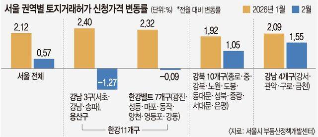 실제 강남 3구와 용산구의 토지거래허가 신규 신청 건수가 서울 전체에서 차지하는 비중은 지난 1월 12.3%에서 2월 11.2%로 줄었다. 한강벨트 7개 구도 같은 기간 24.1%에서 21.5%로 줄었다. 나머지 강북 10개 구는 45.2%에서 47.5%로, 강남 4개 구는 18.4%에서 19.8%로 각각 비중이 커졌다.