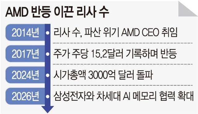 수 CEO는 취임과 동시에 “차세대 CPU와 그래픽 하드웨어 기술을 통해 2년 내 AMD를 되살리겠다”는 당찬 포부를 내놨다. AMD 기적의 시작이었다. 2017년 2월 AMD의 주가는 주당 15.2달러까지 오르며 취임 당시와 비교해 6배 가까이 뛰었다. AMD는 점차 CPU와 데이터센터 사업의 경쟁력을 회복했고, 2024년에는 시가총액 3000억 달러(약 446조)를 처음 돌파했다. 그는 AMD의 반등을 이끈 주역으로 평가되며 ‘칩의 여제’라는 수식어를 얻었다.