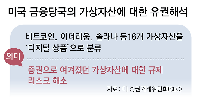 미국 금융당국이 비트코인, 이더리움 등 주요 가상자산을 '증권'이 아닌 '디지털 상품'으로 규정한 것이다.