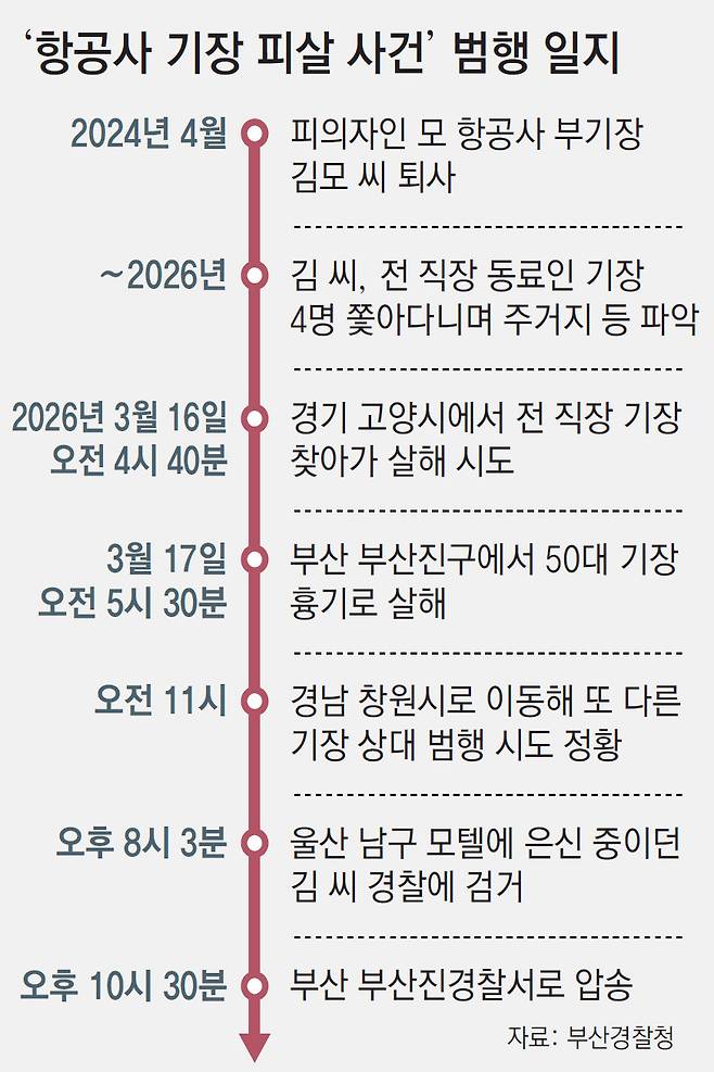 18일 부산경찰청에 따르면 살인 등의 혐의를 받는 전직 부기장 김모 씨는 전날 부산에서 범행을 저지른 뒤 창원으로 이동해 또 다른 기장을 찾아간 것으로 파악됐다. 경찰은 김 씨가 범행에 사용한 흉기를 여행용 가방에 담아 이동한 점 등을 근거로 추가 범행 의도가 있었던 것으로 보고 있다. 해당 기장은 경찰의 신변 보호 조치로 피해를 면했다. 경찰은 이날 김 씨에 대해 살인 혐의로 구속영장을 신청했다.