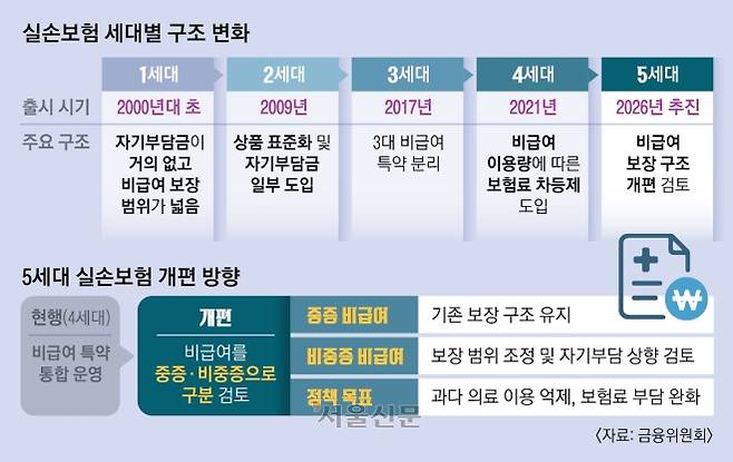 실손보험 상품 구조 개편도 함께 진행되고 있다. 금융당국과 보험업계는 이르면 다음달 ‘5세대 실손보험’ 출시를 준비하고 있다. 기존 4세대 실손보험이 “많이 이용한 가입자의 보험료를 더 올리는 방식”이었다면, 5세대는 아예 비급여 보장 구조 자체를 다시 짜는 데 초점이 맞춰져 있다.