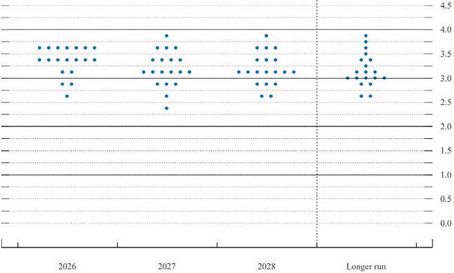 이와 함께 이번 점도표에서는 장기 금리 수준인 중립금리 추정치가 3.1%로 상향된 점이 주목된다. 이는 현재 기준금리에서 약 0.5%포인트 정도만 인하하면 중립 수준에 도달할 수 있음을 의미하며, 향후 금리 인하 폭이 제한될 수 있다는 해석이 나온다.