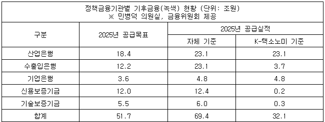18일 국회 정무위원회 소속 민병덕 더불어민주당 의원이 금융위원회로부터 제출받은 자료에 따르면, 산업은행·수출입은행·기업은행·신용보증기금·기술보증기금 등 5대 정책금융기관의 지난해 녹색금융 공급 실적은 자체 기준으로 69조4천억원으로 정부 목표(51조7천억원)를 웃돌았다.