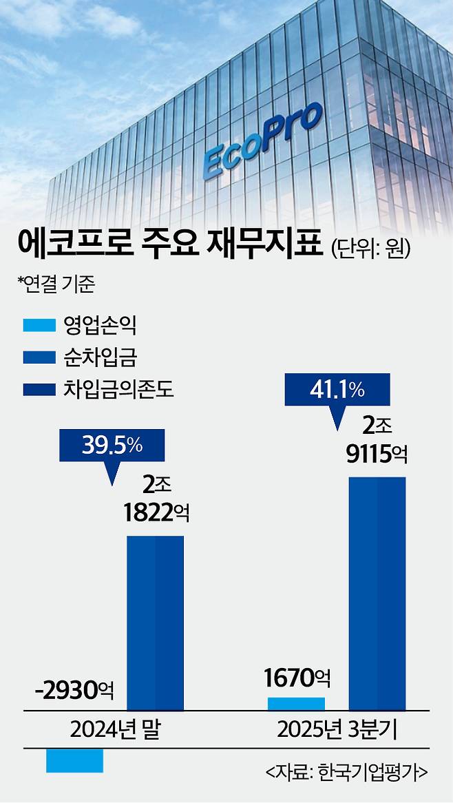 수익 구조 측면에서의 한계도 뚜렷하다. 에코프로는 지난해 연결기준 영업이익이 흑자로 전환(2332억원)했음에도, 니켈 제련소 지분취득 관련 이익(2523억원)과 재고평가손실 환입(1647억원) 등 일회성 요인을 제외하면 실질적인 수익성은 여전히 저하된 상태다.