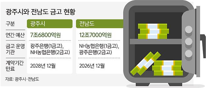 광주시의 1금고는 광주은행, 2금고는 NH농협은행으로 계약 기간은 지난해 1월 시작해 2028년 말까지 4년간이다. 전남도의 1금고는 NH농협은행, 2금고는 광주은행으로 올해 말이면 3년간의 계약 기간이 종료된다.