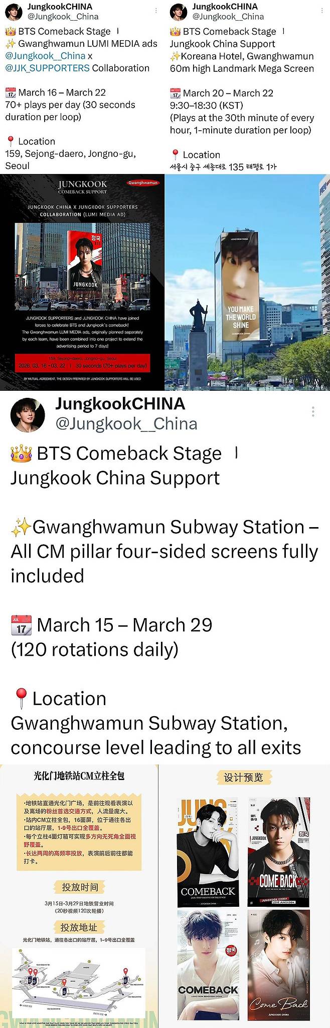 ‘정국 차이나’는 소셜미디어 엑스 계정을 통해 이번 서포트 내용을 알렸다. 먼저 22일까지 광화문 중심지에 있는 루미미디어 전광판에서 정국의 컴백 응원 광고를 하루 70회 이상 송출한다. 해당 전광판은 가로 22.2m, 높이 30.5m 규모의 초대형 디지털 미디어 전광판으로 알려졌다.