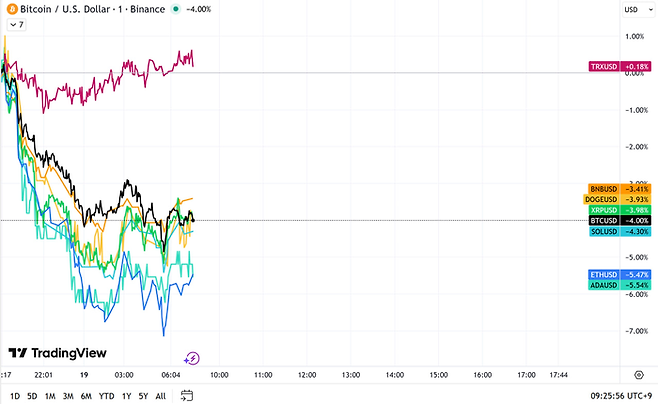 비트코인이 4% 하락하면서 주요 알트코인들도 하락했다.