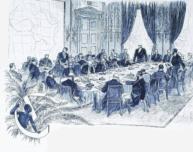 | ▲ 베를린 서아프리카 회담 베를린 회담, 일명 콩고회담 또는 서아프리카 회담 장면 그래픽. 1884년 회담장에서 H. Luders가 그렸다. |