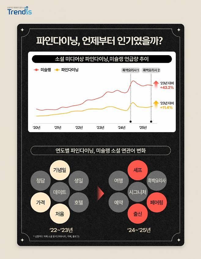 신한카드 빅데이터연구소가 19일 발표한 분석 결과에 따르면 지난해 '미슐랭'과 '파인다이닝'의 SNS(소셜미디어) 언급량은 흑백요리사 방영 전인 2023년 대비 각각 43.2%, 11.4% 증가했다.