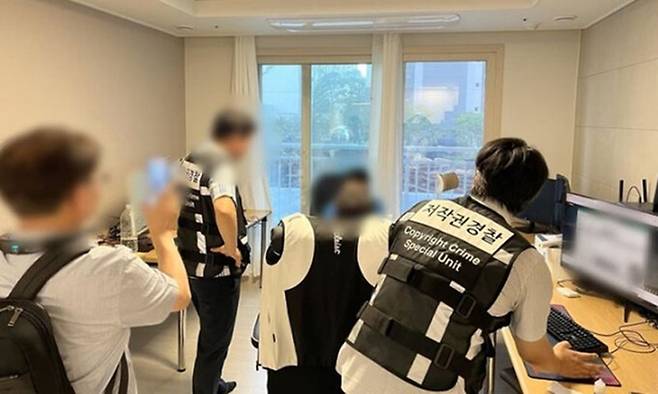[문화체육관광부는 대전지방검찰청과의 수사 협력을 통해 대규모로 불법 유통한 사이트 ‘아지툰’ 운영자를 구속하고 사이트를 즉각 폐쇄했다고 27일 밝혔다. 사진은 ‘아지툰’ 운영자 검거 현장에서 PC 수색 및 진술 확인을 하는 모습. (사진=문화체육관광부 제공)]