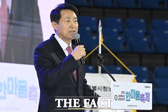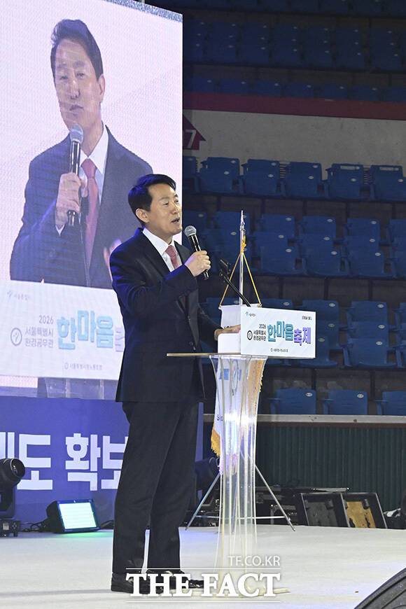 [더팩트 | 송호영 기자] 오세훈 서울시장이 19일 오전 서울 송파구 서울특별시교육청 잠실학생체육관에서 열린 '2026년 환경공무관 한마음 축제'에 참석해 축사를 하고 있다.