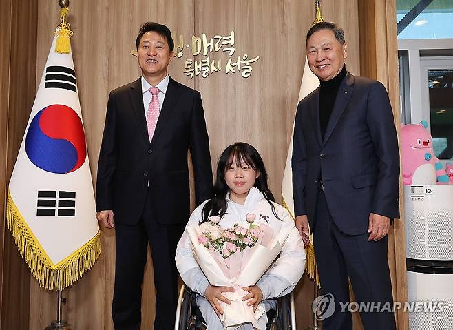 (서울=연합뉴스) 김주형 기자 = 오세훈 서울시장이 19일 서울시청 시장실에서 2026 밀라노 코르티나담페초 동계올림픽, 서울시청 소속 참가 선수들과 오찬간담회를 하기에 앞서 장애인 스키 김윤지 선수와 기념 촬영을 하고 있다. 오른쪽은 강태선 시체육회 회장. 2026.3.19