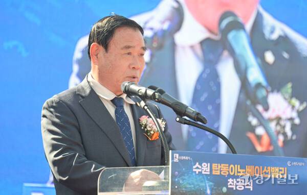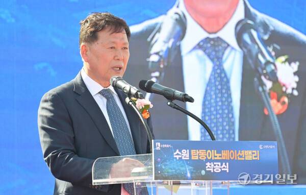 19일 오후 수원특례시 권선구 탑동이노베이션밸리 부지에서 열린 착공식에서 이재식 수원특례시의회 의장이 축사를 하고 있다.