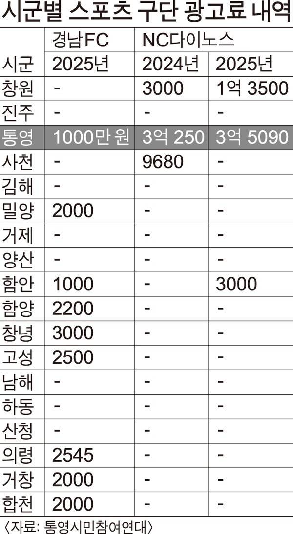 통영시가 지난 2년간 NC다이노스 야구단 광고비로 연고지인 창원시보다 4배가량 많은 예산을 쓴 것으로 나타났다.