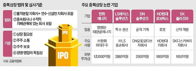 19일 투자은행(IB) 업계에 따르면 한화에너지와 SK플라즈마, LS에식스솔루션 등 다수의 대기업 계열사가 자금 운용에 비상이 걸렸다. 그동안 대기업 계열사 IPO는 외부의 힘을 빌려 사업을 키울 수 있는 자금조달 수단이었다. 하지만 상장 기업이 지배력을 끼치는 모든 계열사가 중복상장 심사 대상에 포함되면서 이런 자금 순환 구조가 사실상 마비됐다.