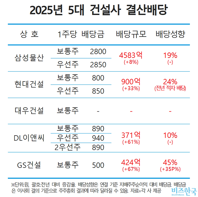 비즈한국이 각 사 결산 자료를 분석한 결과에 따르면 우리나라 5대 건설사의 2025년 결산배당금 규모는 총 6278억 원으로 전년 대비 863억 원(16%) 증가했다. 회사별 배당금 규모는 삼성물산 4583억 원(+8%), 현대건설 900억 원(+33%), DL이앤씨 371억 원(+61%), GS건설 424억 원(+67%) 등이다. 배당을 실시하지 않은 대우건설을 제외한 4개 건설사가 일제히 결산배당 규모를 늘렸다.