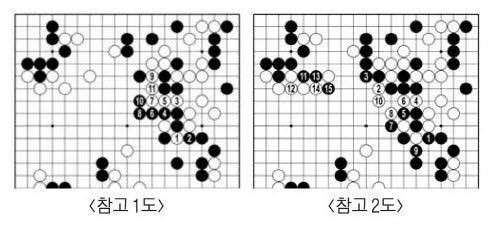 몰리는 박정환이 그저 한 집을 더 내려고만 하지 않았다. 백80에 붙여 흑 모양에 흠집을 내고 82, 84로 찔러 약점을 만든다. <참고 1도> 백1을 서두르면 흑은 망설이지 않고 2로 끊는다. 백9로 흑 석 점을 잡는 것보다 흑 두꺼움이 훨씬 낫다. 왕싱하오가 흑87로 물러난 것은 앞서 백이 묵직하게 움직였기 때문이다. 그렇더라도 인공지능 카타고는 <참고 2도> 흑1로 끊으라 한다. 백이 흑 넉 점을 잡을 때 흑11·13·15로 공세를 펴는 것이 매섭다. 천만다행으로 백92에 이어 싸울 힘을 얻었다.
