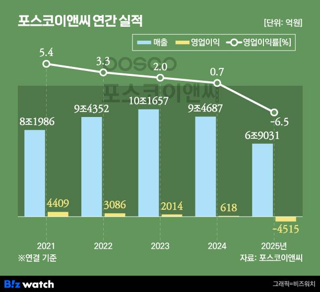 포스코이앤씨는 연결재무제표 기준 지난해 연간 매출 6조9031억원, 영업이익은 -4515억원을 기록했다고 지난 18일 공시했다. 전년도와 비교했을 때 매출액(9조4687억원)은 27.1% 감소했으며 영업이익은 618억원에서 적자 전환했다. 당기순손익은 -4776억원이다.