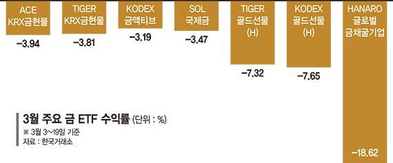 국제 금 현물을 추종하는 'KODEX 금액티브'와 'SOL 국제금'은 각각 -3.19%, -3.47% 수익률을 기록했다. 국제 금 선물 가격을 따르는 'TIGER 골드선물(H)'(-7.32%), 'KODEX 골드선물(H)'(-7.65%)은 7%대 낙폭을 보였다.