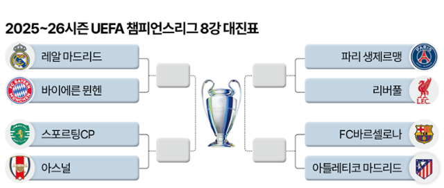 뮌헨은 레알 마드리드(스페인)와, '디펜딩 챔피언' PSG는 리버풀(잉글랜드)과 맞붙는 등 8강 대진표가 완성됐다.