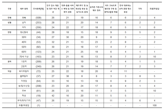 이어 의료·돌봄 서비스 확대 등 의료복지 강화가 21%, 레드푸드 및 농축산업 육성 등 농가소득 증대가 19%로 뒤를 이었다.