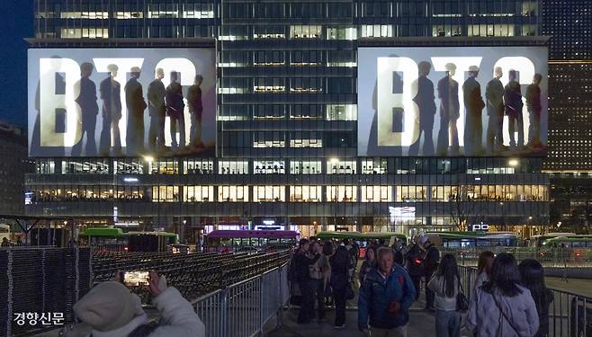 그룹 BTS의 컴백 공연을 이틀 앞둔 19일 무대가 설치된 서울 광화문광장 맞은편 전광판에 홍보 영상이 상영되고 있다.