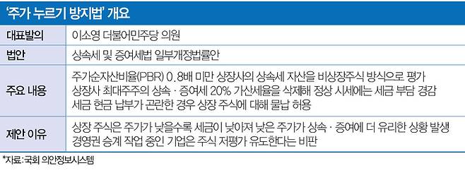 최근 정부·여당이 추진하는 ‘상속세·증여세법 일부개정안(주가 누르기 방지법)’도 이런 우려가 단초가 됐다. 현행 세법 체계는 상장 주식의 상속·증여세를 상속·증여 시점 전후 각 2개월, 총 4주 평균 주가로 산정한다. 즉, 시가로 상속·증여세를 매기므로 주식을 물려줄 때 PBR이 1배 미만이면 유리하다. 이 때문에 현 세법으로는 승계를 앞둔 대주주가 주가를 낮게 유지할 유인이 생긴다는 비판이 일었다.