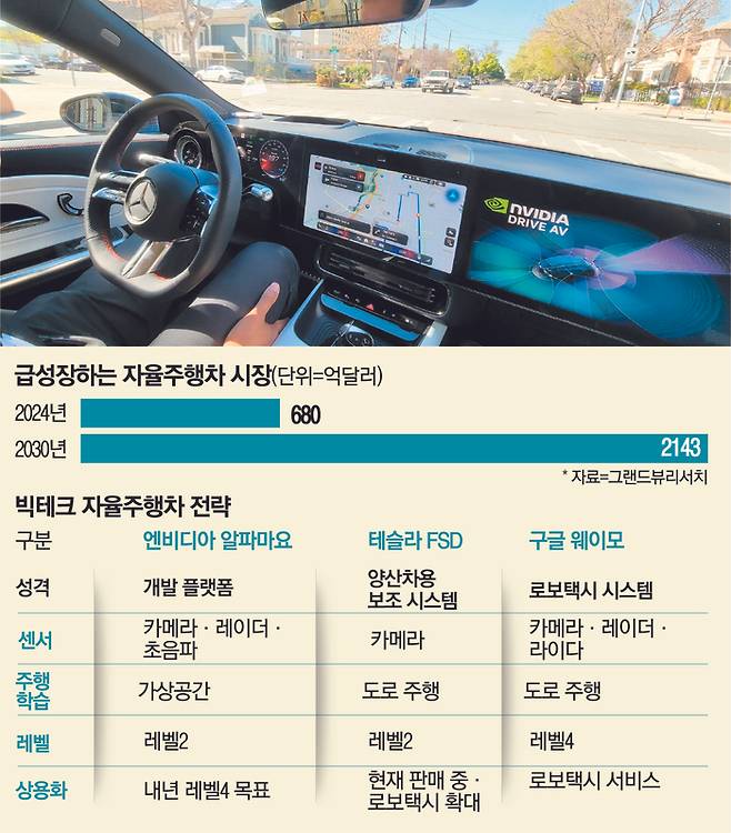차량 주행 방식은 테슬라의 FSD나 실리콘밸리 일대에서 운행 중인 구글 웨이모 로보택시와 크게 다르지 않아 보였다. 그러나 차이는 학습 방식에 있다. 테슬라와 웨이모가 오랜 기간 실제 도로 주행 데이터를 축적해 성능을 끌어올린 반면, 엔비디아는 현실 세계에서 수집한 데이터를 기반으로 가상공간에서 대규모 시뮬레이션을 반복해 모델을 빠르게 개선하는 방식에 무게를 두고 있다. 엔비디아에 따르면 이 차량 개발에는 약 100만시간 규모에 달하는 인간 주행 데이터와 시뮬레이션 데이터가 활용됐다. 하지만 수만 개 그래픽처리장치(GPU)를 동원하면 수백만 시간 분량 시뮬레이션도 단 하루 만에 돌릴 수 있다.