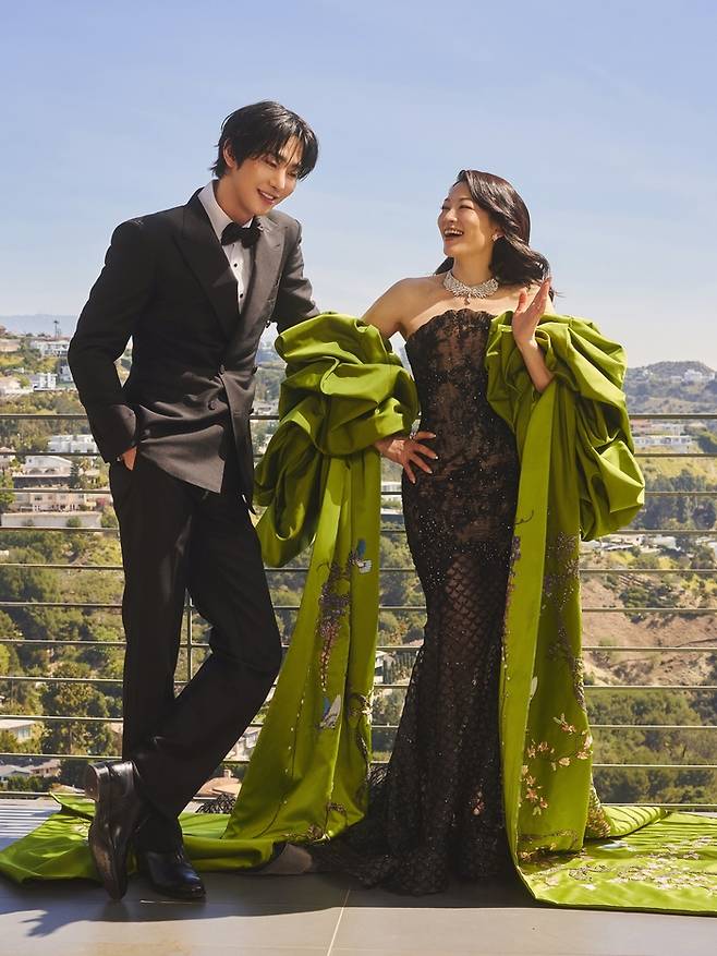 아덴 조는 자수와 망사 디테일이 돋보이는 블랙 드레스에 강렬한 연두색 실크 케이프를 매치해 동양적이면서도 현대적인 미를 동시에 드러냈다. 안효섭 역시 클래식한 블랙 턱시도로 모델 못지않은 수트 핏을 선보였다.