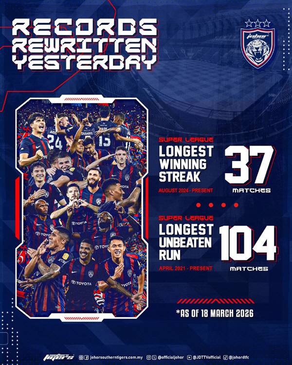 조호르는 2025~2026시즌 말레이시아슈퍼리그에서 19전 전승을 질주하며 최종 라운드를 5경기 남겨두고 조기 우승을 확정했다. 그 이후인 18일에 벌어진 PDRM과의 리그 20라운드에서도 7대0 대승을 따내며 무적의 20연승을 달렸다.