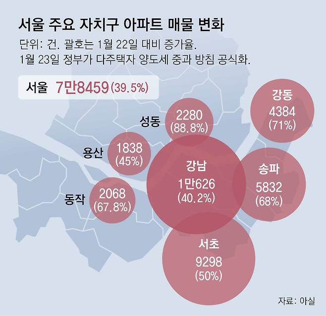서초구에서 영업하는 한 공인중개사는 “다주택자 물건이 싸게 나오니까 1주택자들도 이때 못 팔면 한동안 못 팔겠다 싶어서 집을 내놓는 경우가 있다”며 “지금 매물 수가 지난해 말의 거의 2배 수준”이라고 말했다. 고준석 연세대 상남경영원 교수는 “4월 중순까지 다주택자 매물이 거래되며 하락세가 강남을 비롯한 인근 자치구로 확산할 수 있다”며 “대출 규제로 집을 살 수 있는 사람이 적어 매물도 계속 쌓일 가능성이 높다”고 전망했다.