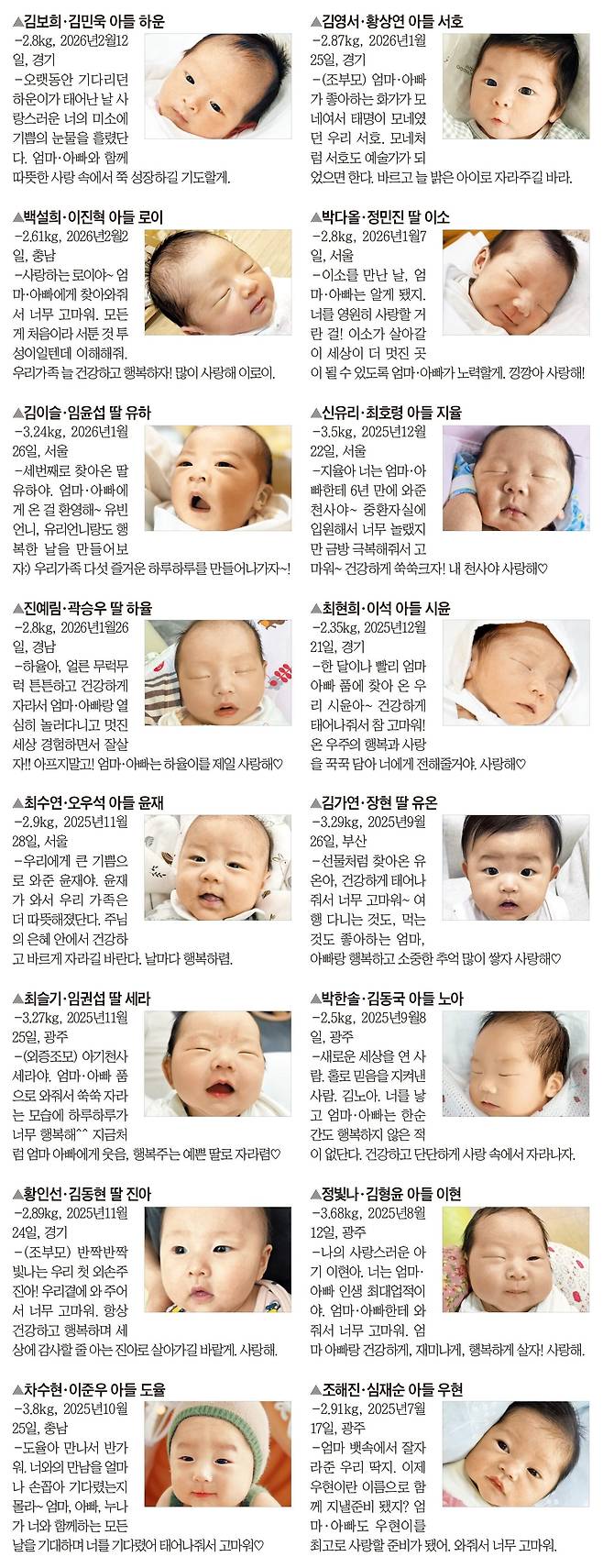 온 가족에게 기쁨을 안겨 준 아기의 탄생을 알려주세요. 홈페이지 주소 입력창에 아가야안녕.com이라고 입력하면 됩니다. 매일유업 육아 정보 사이트 매일아이(maeili.com)를 통해서도 접속할 수 있습니다. 추첨을 통해 출산 소식과 사진이 지면에 실린 가족에게는 ①케이크 구매권 ②엄마와 아이를 위한 매일두 포인트 3만원 ③출산 소식을 생일 날짜 본지 1면에 담은 PDF 파일 ④조선일보 1개월 무료 구독권을 드립니다. 당첨자 중 한 가족을 선정하여 해당 지면을 고급 프레임에 담아 제공하는 조선일보 리프린트도 제작해 드립니다. 홈페이지에서는 균형 영양식 메디웰 2만원 할인 혜택도 드리고 있습니다.