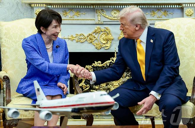 (로이터=뉴스1) 안은나 기자 = 도널드 트럼프 미국 대통령과 다카이치 사나에 일본 총리가 19일(현지시간) 미국 워싱턴 백악관 오벌오피스에서 악수하고 있다.