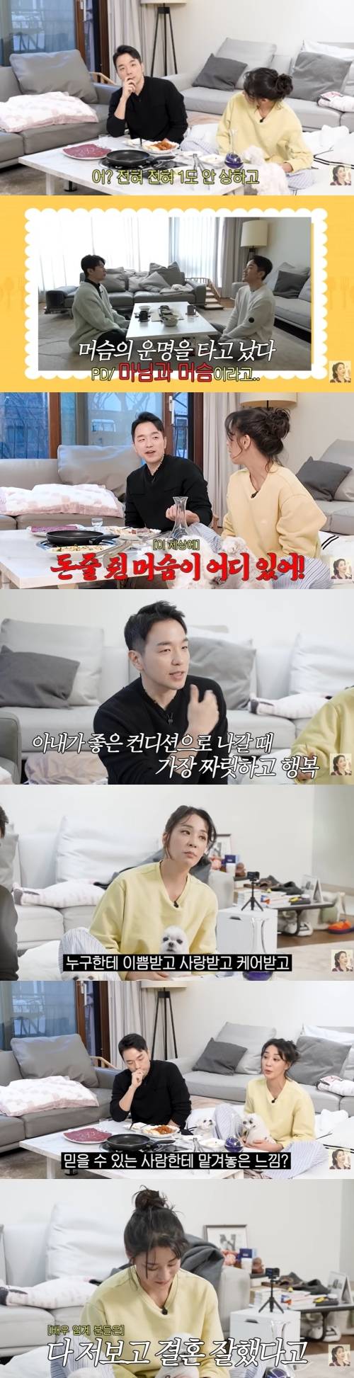남편은 "아내에게 늘 미안하고 감사한 마음이 있다. 누가 봐도 와이프가 일방적으로 잘해준다. 운동할 때 운동복이나 운동화 모자랄까봐 걱정하고, 골프 연습 더 해야되는거 아니냐고 챙겨준다"며 "내가 해주는 건 심적으로 안정감을 주고 싶다. 삶이 재밌고 행복하다는 느낌을 주고 싶다"며 진심을 전했다.