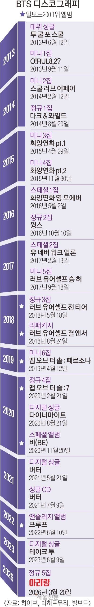 BTS는 2022년 6월 데뷔 9주년을 맞이해 발표한 앤솔러지 앨범 ‘프루프’ 이후 오랜 ‘군백기’에 들어갔다. 병역 의무를 모두 마친 BTS는 ‘아리랑’이라고 이름 붙인 정규 5집 앨범을 20일 공식 발표하고 21일 서울 광화문광장 콘서트를 통해 자신들이 4년 만에 완전체로 돌아왔음을 선언한다.