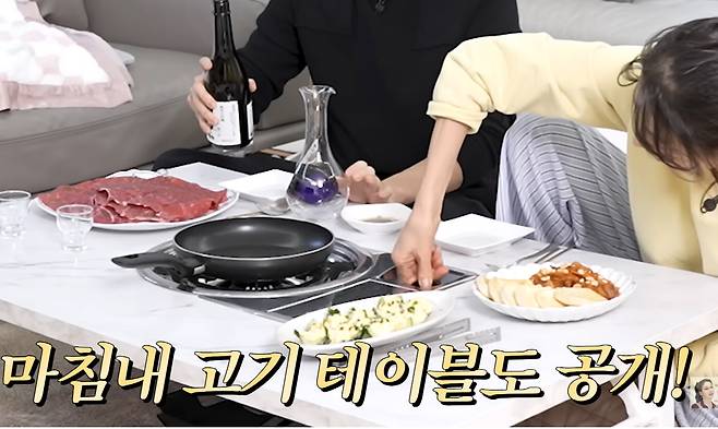 이들은 거실에 사둔 고깃집 테이블을 사용하기로 했다. 실제로 가운데 불판이 구비된 'K-고깃집 테이블'이 눈길을 끌었다.