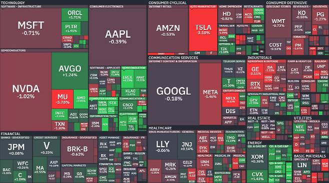 이날 증시에서는 대형 기술주들이 전반적으로 약세를 보였다. 이날도 대형 기술주들은 대부분 하락했다. 엔비디아(-1.02%), 알파벳(-0.19%), 애플(-0.39%), 마이크로소프트(-0.71%), 아마존(-0.52%). 메타(-1.46%), 테슬라(-3.18%) 등이 하락했다. 테슬라는 자율주행 시스템 관련 규제 리스크까지 겹치며 낙폭이 확대됐다.