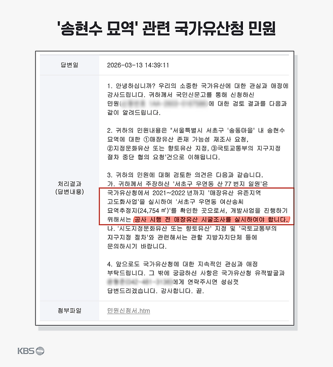 지난 13일 받은 국가유산청의 답변을 보면 묘역이 있는 곳은 국가유산청에서 2021~2022년까지 '매장 유산 유존지역 고도화 사업'을 실시해 '여산송씨 묘역 추정지'를 확인한 곳이라고 돼 있습니다.