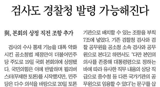 현 검찰청을 대체할 공소청법 제정안이 19일 국회 본회의에 상정됐다. 국민의힘은 즉각 필리버스터에 돌입했고, 민주당은 20일 토론을 종료하고 법안을 처리할 방침이다. 민주당은 중대범죄수사청(중수청)법도 상정한 뒤 같은 절차를 거쳐 21일 통과할 방침이다.