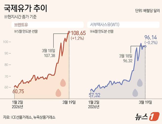 (서울=뉴스1) 김지영 디자이너 = 국제유가가 중동 전쟁 확산 우려 속에서 또 다시 요동쳤다. 중동 전쟁 상황과 공급 우려 속에서 급등락을 이어갔다. 19일(현지시간) 북해 브렌트유는 장중 배럴당 119달러를 돌파하며 급등했으나 이후 상승세가 꺾이며 108.65달러로 마감했다. 미국 서부텍사스산원유(WTI)도 장중 상승세를 보이다가 96.14달러로 소폭 하락했다.