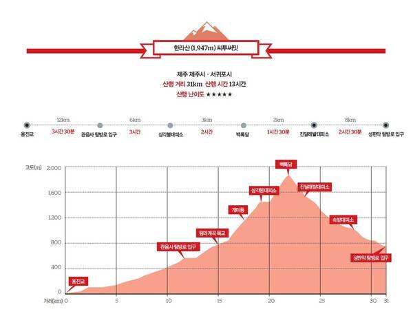 한라산 씨투써밋의 대략적인 계획은 이렇다. 제주의 정북쪽, 제주항 용진교에서 출발해 관음사 탐방로 입구까지 도로구간을 걷는다. 관음사 코스로 백록담을 오르고 성판악 코스로 하산한다. 도로 12km, 산행 19km, 총 31km 고난이도 장거리 트레킹이다.