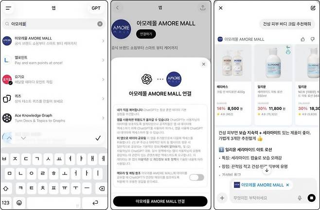 아모레퍼시픽은 오픈 AI의 챗GPT 내에서 자사 공식 쇼핑 채널인 '아모레몰' 앱을 선보이며, 대화형 기반의 새로운 쇼핑 경험을 제공한다고 밝혔다.