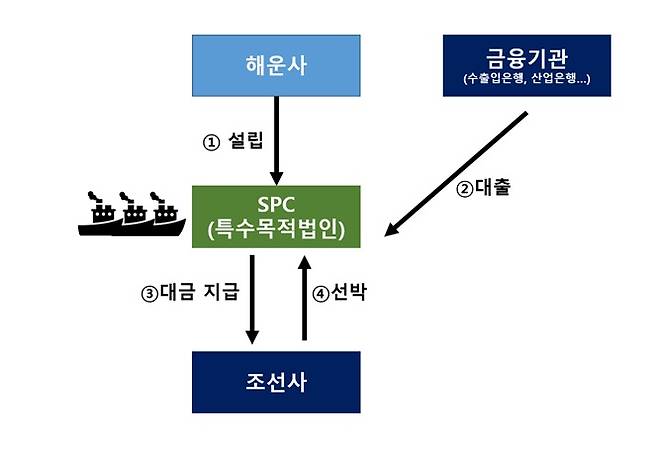 해운사는 먼저 특수목적법인(SPC)을 설립합니다. 일종의 페이퍼컴퍼니를 세우는 것이죠. 한국수출입은행, 산업은행 등 정책금융기관 등은 선박 매입에 필요한 자금을 SPC에 대여해줍니다. 동시에 선박투자회사가 펀드를 조성해 SPC에 자금을 넣어주기도 하고요. SPC는 조달한 자금을 조선사에 지급하고 선박을 인도받습니다.