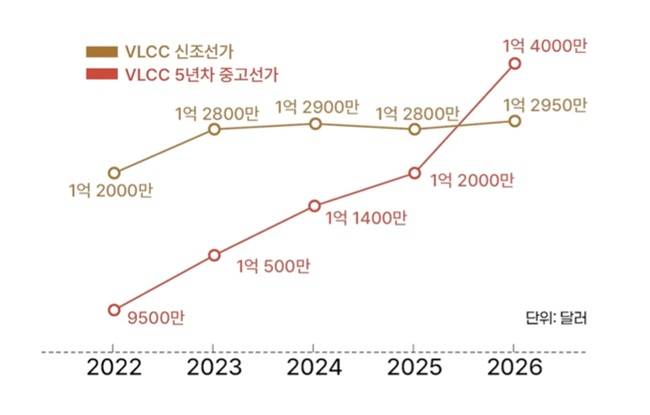 중고선 몸값 역시 마찬가지입니다. 5년차 기준 VLCC 중고선가는 현재 1억4000만달러로 연초 대비 16% 상승했습니다. 단기 운임료가 크게 상승하면서 중고선가가 신조선가보다 더 비싼 기현상까지 벌어지고 있습니다.