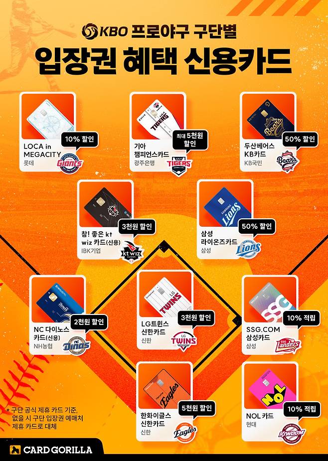 고승훈 카드고릴라 대표는 "프로야구 인기가 꾸준히 지속되면서 10개 구단 공식 제휴 카드가 속속들이 출시되고 있다"며 "특히 단순 입장권 할인부터 응원용품, 먹거리까지 야구 직관에 필요한 대부분의 영역에서 혜택을 제공하고 있다"고 말했다.