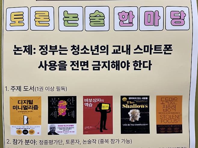 2025년 학생자치회에선 학교생활 규정의 개정을 앞두고 스마트 기기가 공부에 방해가 된다는 주장이 많았다면, 올해는 공부하는 데 필요하다는 목소리가 더 커진 듯하다. 조만간 규정의 재개정을 위해 다시 아이들의 의견을 수렴할 계획인데, 그 결과가 뒤바뀔 가능성이 커 보인다.