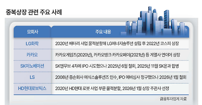 투자자 권리 보호 차원에서 중복상장을 원칙적으로 금지하는 취지엔 공감하지만, 기업공개(IPO)를 조건으로 수천억을 투자한 재무적투자자(FI)들의 자금 회수 선택지가 줄어들 수 있다는 우려 때문이다.