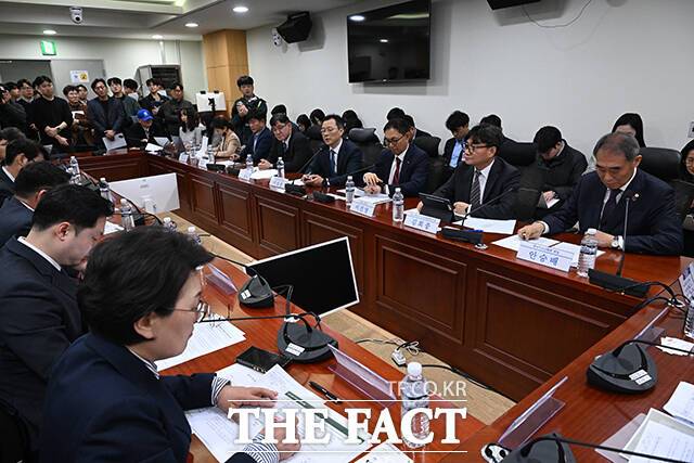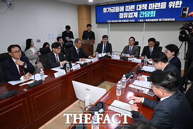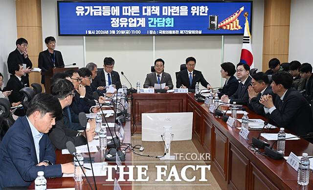 [더팩트ㅣ국회=박헌우 기자] 민병덕 더불어민주당 을지로위원장(가운데)이 20일 오전 서울 여의도 국회 의원회관에서 열린 유가 급등에 따른 대책 마련을 위한 정유 업계 간담회에 참석해 모두발언을 하고 있다.
